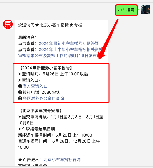 關(guān)注【大京事】微信公眾號,在對話框回復(fù)“小車搖號”即可獲取最新北京市小車指標(biāo)申請入口、搖號結(jié)果查詢、復(fù)查申請、中簽公示等內(nèi)容。