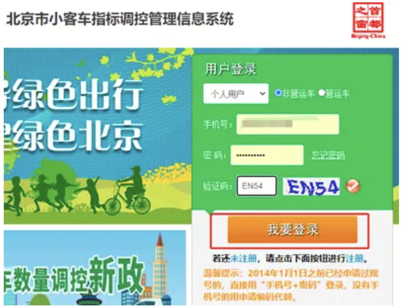 第一步:打開北京市小客車指標(biāo)調(diào)控管理信息系統(tǒng),輸入手機(jī)號、密碼后,點擊【我要登錄】按鈕,登錄系統(tǒng)。