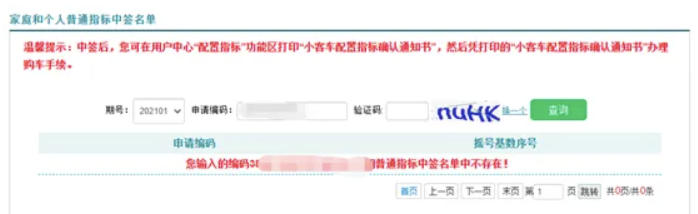 第三步:勾選查詢的期號,例如202101代表查詢2021年第一期小客車指標(biāo)申請搖號結(jié)果,大家可以輸入申請編碼后,點擊【查詢】按鈕,結(jié)果會直接在頁面中呈現(xiàn)