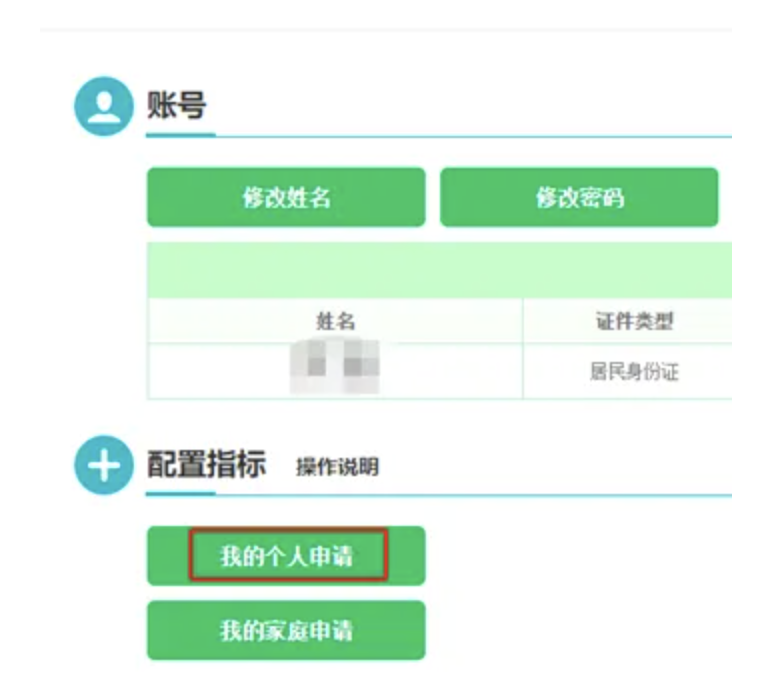 第二步:進(jìn)入用戶中心后,在配置指標(biāo)中,可以看到有【我的個人申請】和【我的家庭申請】,這里以個人申請舉例。點擊【我的個人申請】按鈕,進(jìn)入個人小客車配置指標(biāo)申請表結(jié)果頁面