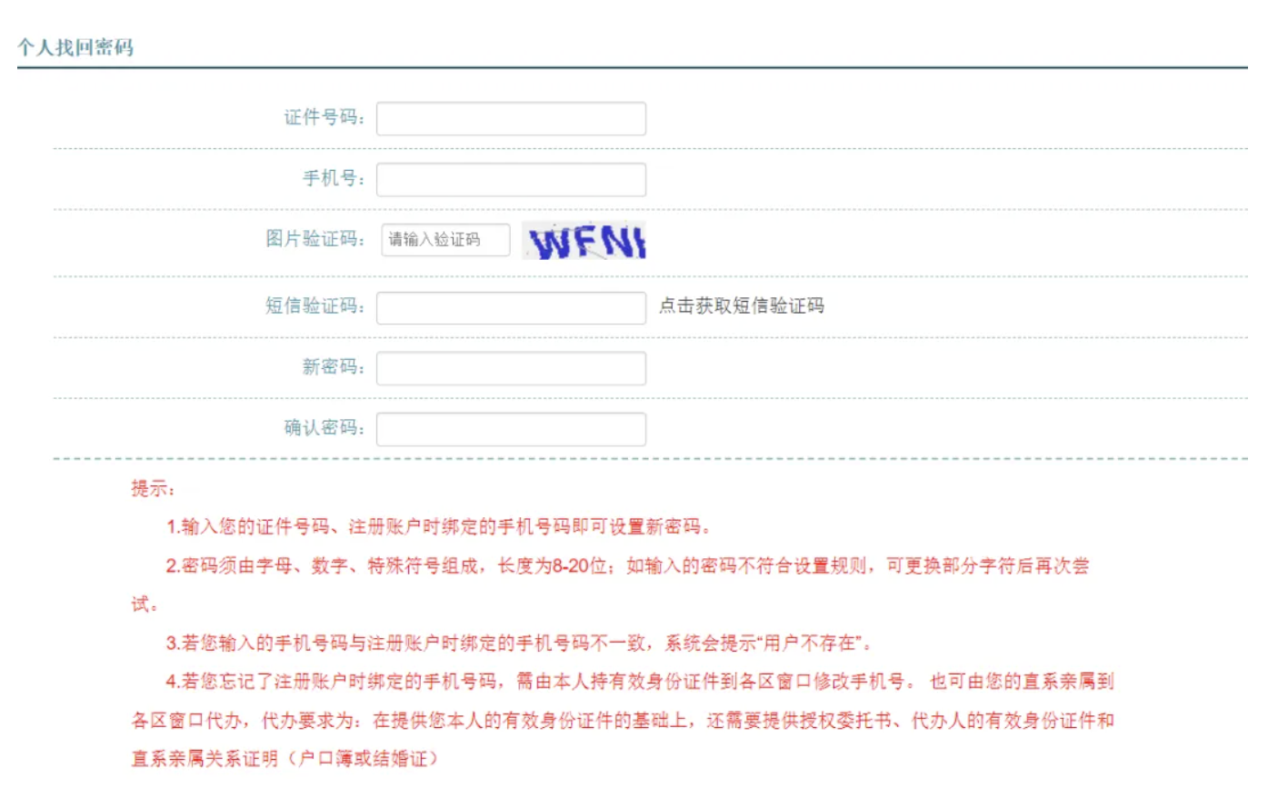 答 :點擊“用戶登錄”模塊的“忘記密碼”按鈕后,輸入您的證件號碼、注冊賬戶時綁定的手機(jī)號碼即可設(shè)置新密碼。