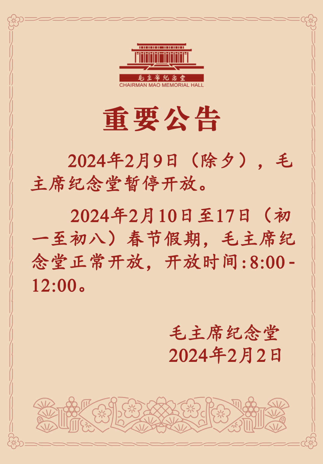 2024年2月9日(除夕),毛主席紀(jì)念堂暫停開放。