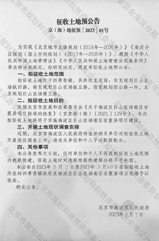 征收土地預(yù)公告(京(海)地征預(yù)〔2023〕01號) 海淀區(qū)巨山農(nóng)場南區(qū)安置房項目