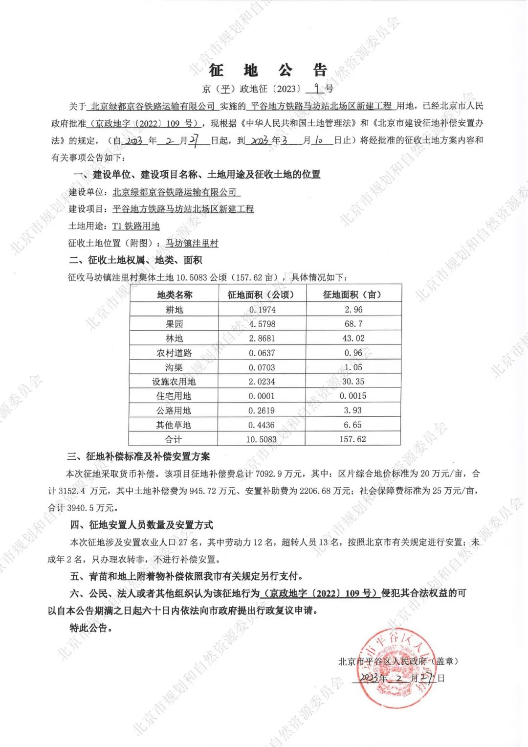 北京平谷區(qū)馬坊鎮(zhèn)洼里村征地公告