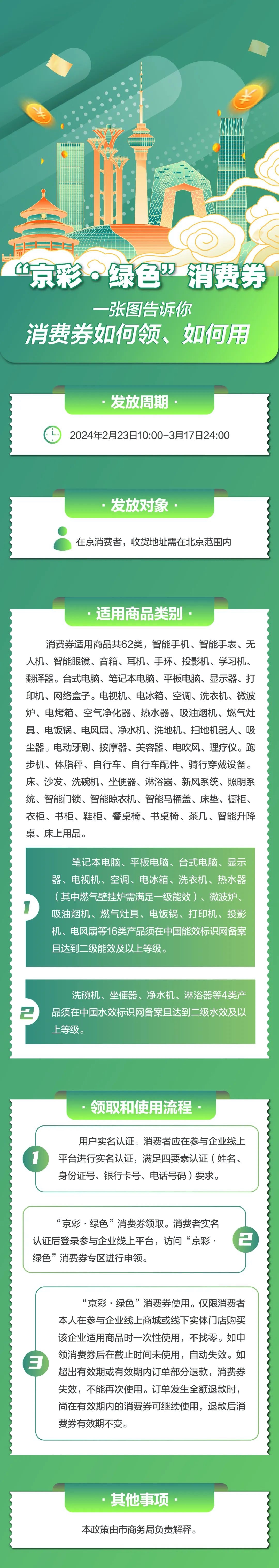 關(guān)注【大京事】微信公眾號(hào),在對(duì)話框回復(fù)【消費(fèi)券】獲2024京彩綠色消費(fèi)券發(fā)放時(shí)間/入口,以及北京各區(qū)消費(fèi)券領(lǐng)取入口和指南。