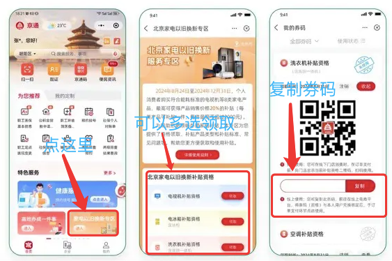 - 在“首頁”-“特色服務(wù)”點(diǎn)擊“家電以日換新專區(qū)”或搜索“北京家電以舊換新”,進(jìn)入資格領(lǐng)取頁面,領(lǐng)取八大類補(bǔ)貼資格碼。(再次提醒:雖然名稱叫以舊換新,但是直接購買新的一樣享受補(bǔ)貼!別弄錯(cuò)了哦)