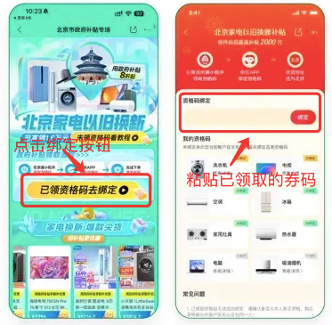 打開京東商城頁面,進入“北京家電以舊換新”專場,找到“綁定資格碼”入口,使用上一步領取的券碼進行綁定。