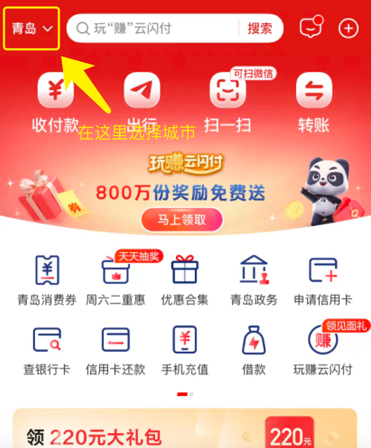 首先下載登錄云閃付App。如果你本人不在青島,請(qǐng)先在云閃付App首頁(yè)把所在城市改為青島,否則領(lǐng)券界面不能顯示。