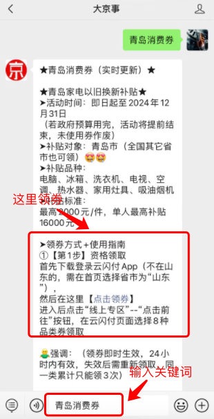 沒(méi)有云閃付App需先自行下載,已有云閃付的可直接在「大京事」公眾號(hào)回復(fù)“青島消費(fèi)券”進(jìn)入領(lǐng)券入口。