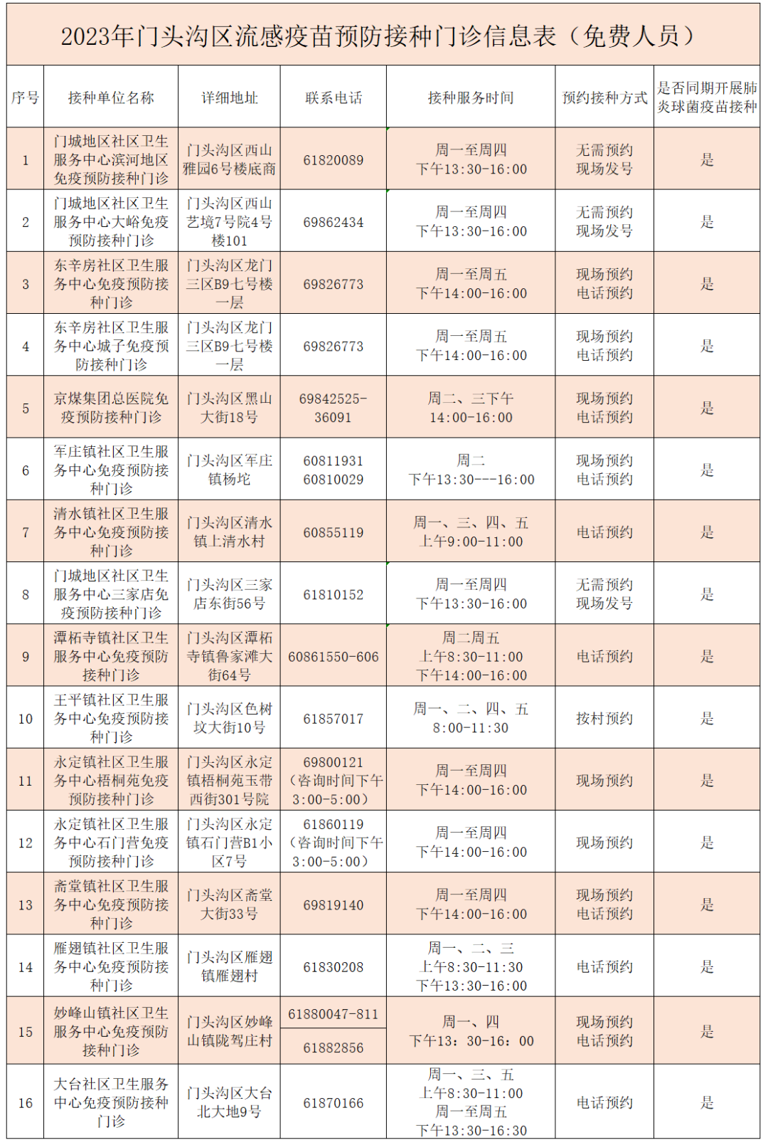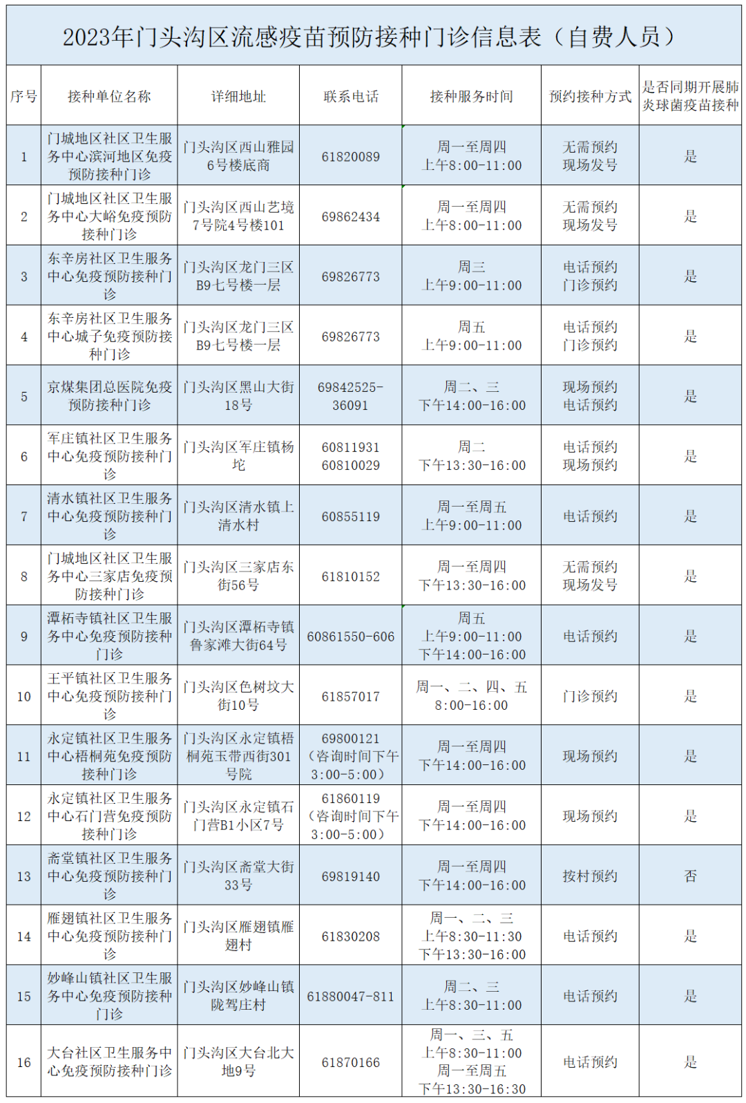 2023年流感疫苗預防接種工作即將開始,以下是門頭溝區(qū)免費流感疫苗和自費流感疫苗接種門診服務時間、咨詢電話及詳細地址。