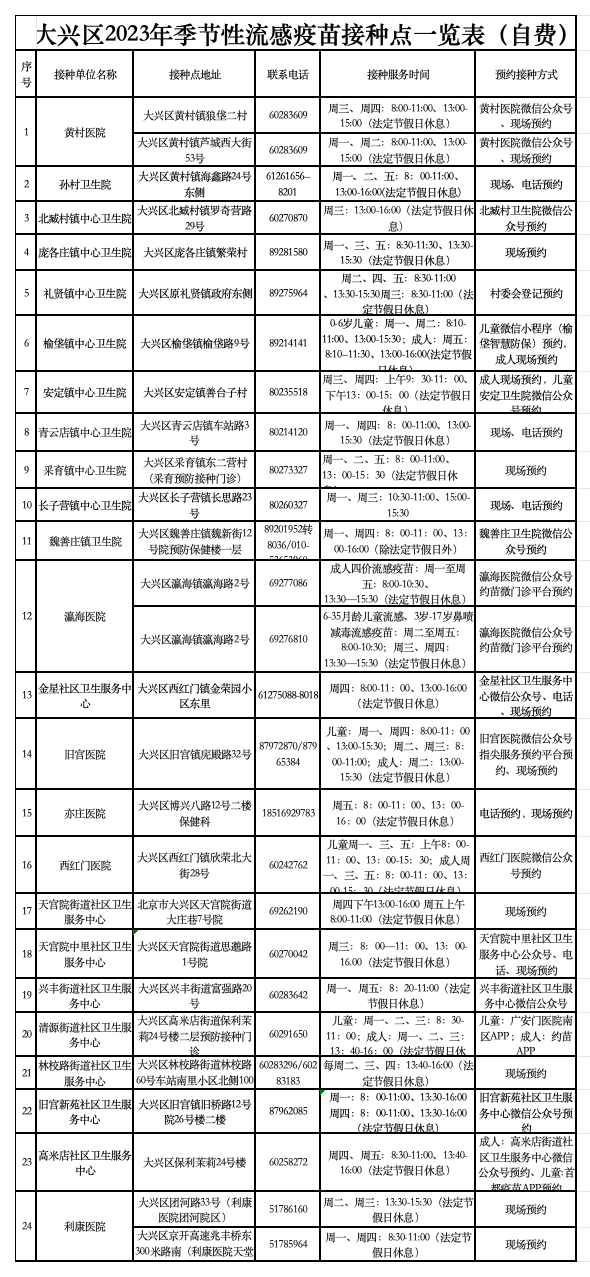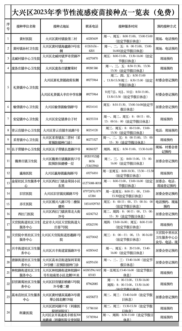 2023北京大興區(qū)流感疫苗免費接種門診(地址+電話)