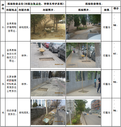 1.白浮泉路祈??绝喌曛苓吘G地臟亂。2.白浮泉路與涼水河路交叉口周邊缺株。3.北京安泰鋼研超硬材料制品有限責任公司東側缺株。4.婦幼保健院東側綠地臟亂。5.龍泉居羊蝎子門前周邊綠籬缺失, |